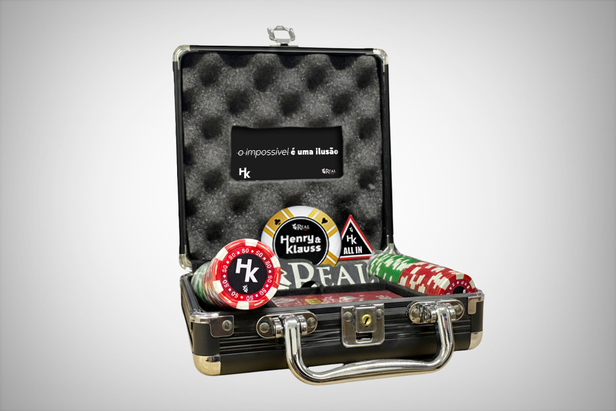 A maleta com 100 fichas de poker Henry & Klauss by Real Poker eleva o jogo a um novo nível de exclusividade e espetáculo. Desenvolvida em edição especial, combina sofisticação, mistério e acabamento premium em cada detalhe. As fichas personalizadas trazem a identidade marcante da dupla, tornando a experiência única e memorável. É o presente ideal para fãs de magia, colecionadores e apreciadores de poker que valorizam estilo, impacto e qualidade profissional.